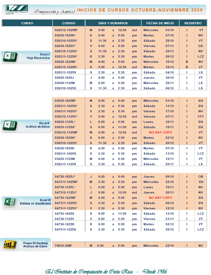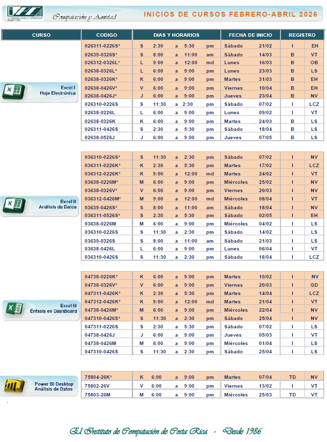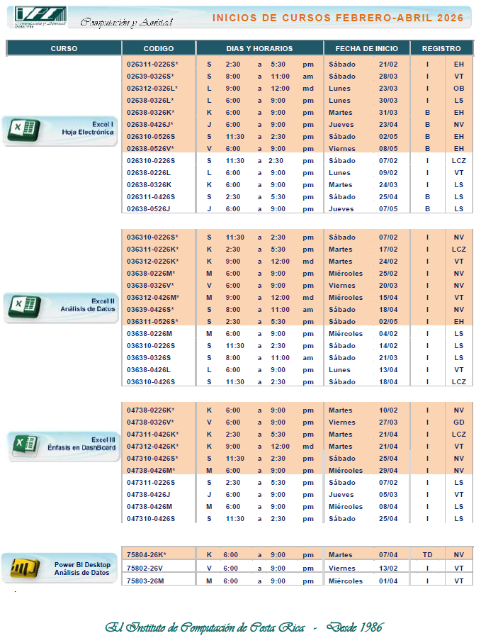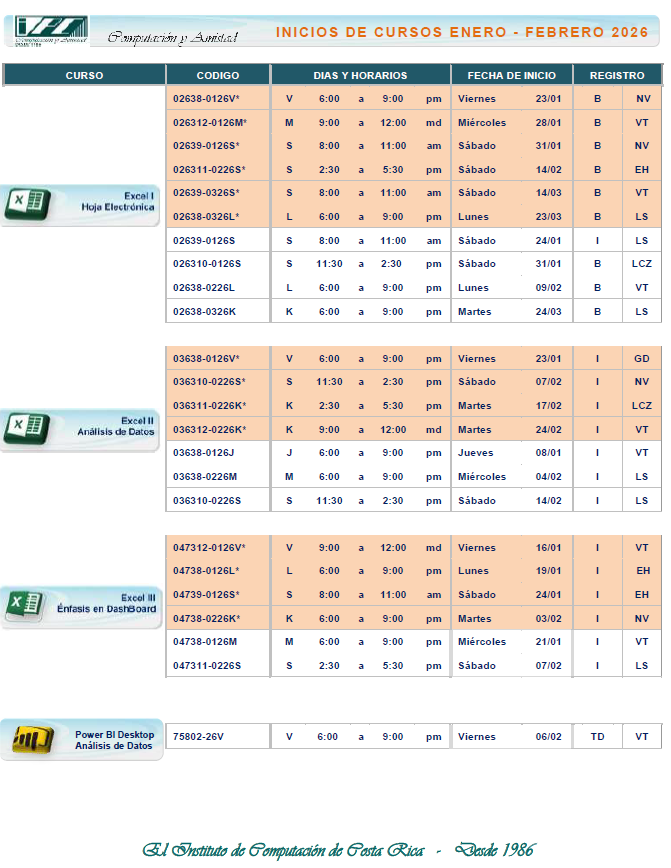 Horario e Inicios MS Excel – Especialista, Control y Análisis de Datos