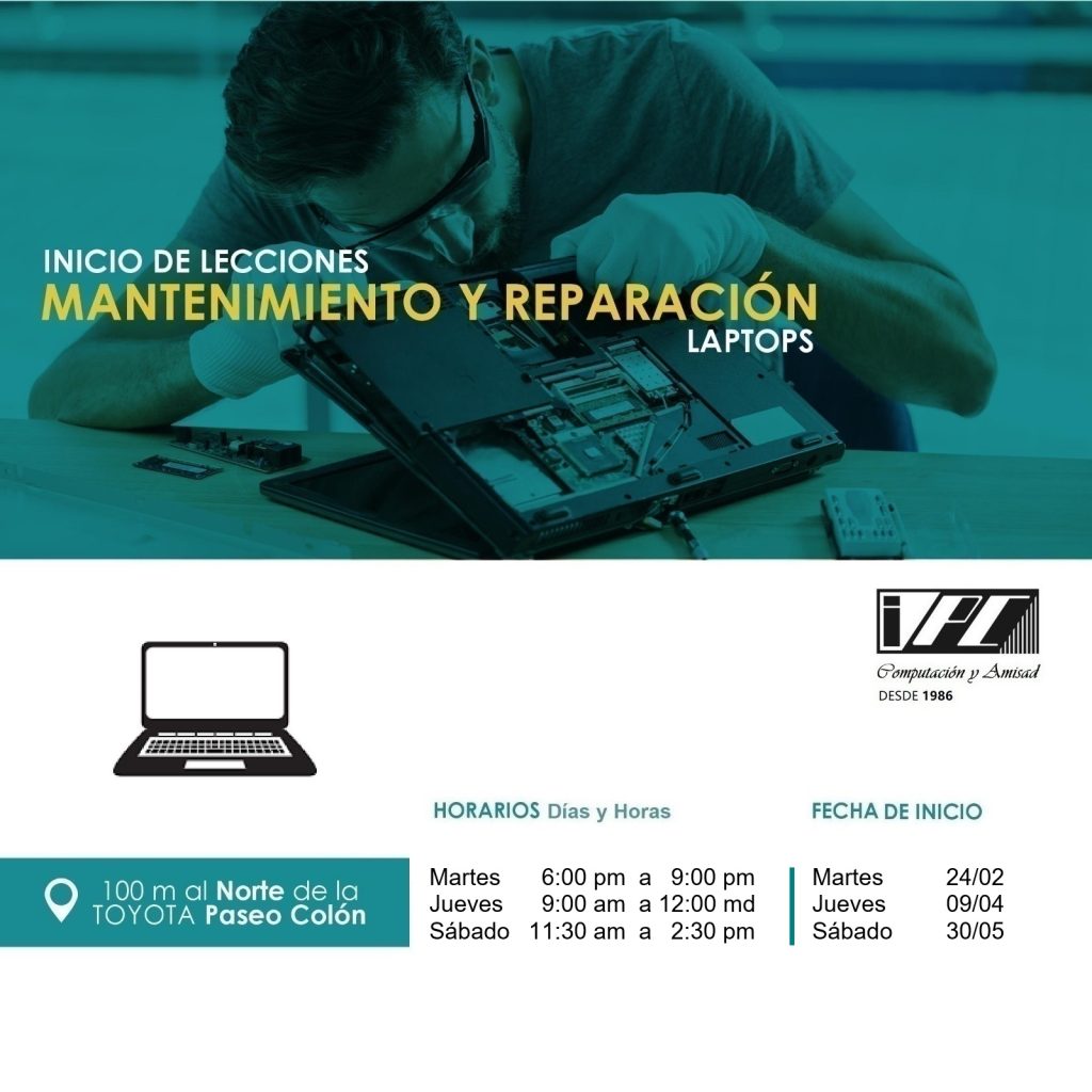 MANTENIMIENTO LAPTOP (PORTÁTIL) DIRIGIDO – Personas que desean conocer su portátil. – Personas que desean aprender la reparación y mantenimiento . – Personas que desean conocer las técnicas profesionales. Abajo EncontraráUna Súper OfertaPara HOY REQUISITOS 1- Mayor de 18 Años 2- Conocimiento Sistema Operativo Windows 3- Experiencia en uso de Internet OBJETIVOS CONTENIDO DURACIÓN 24 horas – 6 semanas HORARIO INICIAL METODOLOGIA El Curso se Realizara en Nuestras InstalacionesCada Alumno con una Computadora, para sus Clases.Es un Curso muy Agradable, Completamente Asistido. Garantizado 100% TARIFAS Y OFERTAS Nuestras Tarifas y Ofertas de la SemanaClic aquíhttps://wa.me/50661352828Números de ContactoCentral Telefónica 22571010WhatsApp 61352828 PrefieresChat por Audios en WhatsApphttps://wa.me/50661352828 INCLUYE Manual de Curso Prácticas DirigidasDocumentos para Evaluación Certificado de Aprobación o Participación ENVÍA LA PALABRA«LAPTOP»https://wa.me/50661352828Y RecibeSUPER OFERTAWhatsApp Además, Podría interesarte: ESPECIALISTA MS EXCEL 2021 VER MÁS Nuestro Programa de Módulos MS OFFICEo Cursos Libres VER MÁS Me prepararé y algún día llegará mi oportunidad. Abraham Lincoln